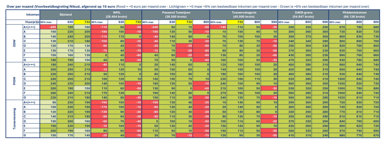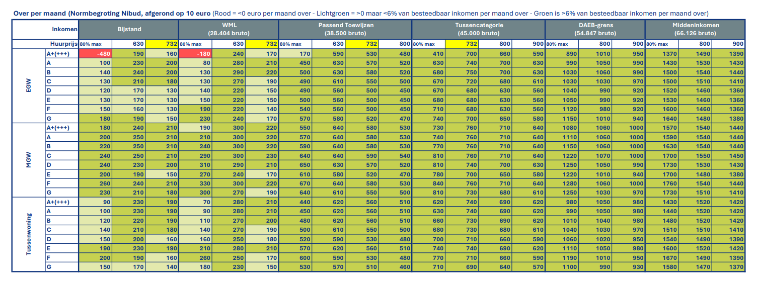 Vrijwel alle 18 corporatiedoelgroepen wonen betaalbaar tot zeer betaalbaar als we de Nibud-normbedragen als uitgangspunt nemen (zie de donkergroene velden in tabel 1 hieronder (over alleenstaanden) én de tabellen 3 en 5 over stellen (met kind) onderaan het artikel). In vrijwel alle woningtypen houden de huishoudens- en inkomensgroepen ook bij hogere huurprijzen geld ‘over’, na het betalen van de huur en energiekosten. Ongeacht het type woning waar ze in wonen: of het nu een energiezuinige flat is, of een eengezinswoning met een ‘slecht’ label, of huishoudens met een inkomen op bijstandsniveau. Dat laatste is een duidelijke verbetering ten opzichte de situatie in 2021 (in analyse op basis van het WoON 2021. Dirks, F en Weulen Kraneberg, D. (2024, 18 december). Sturen op woonlasten. Een verkenning naar de mogelijkheden. Platform31. Gevonden op https://www.platform31.nl/artikelen/sturen-op-woonlasten/ 5 ) Middeninkomens houden zoveel geld ‘over’, dat een huurprijs rond de middenhuurgrens (1.184,82 euro 2025) in de meeste gevallen ook betaalbaar is.
