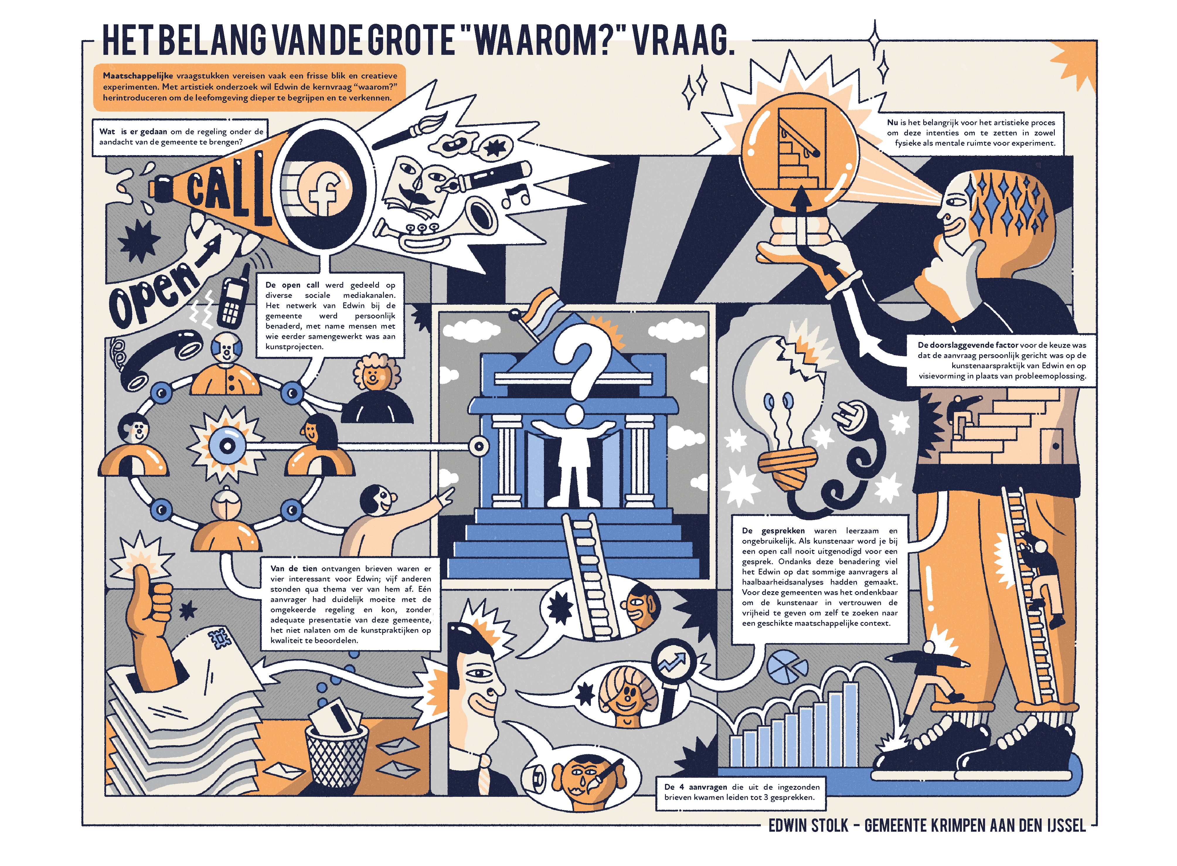 “Een nieuw perspectief van een kunstenaar helpt dan”, legt Jacobs uit. “Er is nog te weinig zichtbaar resultaat en dan is het goed om te kijken welke invalshoek we nog niet hebben.” Alleen al de gesprekken tussen de kunstenaar en beleidsmedewerkers helpen daarbij. “Voor mij is het echt heel inspirerend” vertelt Jacobs. “Het is ook gezond vind ik om buiten een bepaalde context te leren kijken en andere geluiden op te halen en te zien. Het is dus vooral ook een gespreksopener voor de betrokkenen bij deze opgave om tot nieuwe invalshoeken te komen.” Dat onverwachte perspectief zit ook al in het uitgebreide artistieke onderzoek van Stolk en de gesprekken die hij aangaat met ambtenaren, zonder dat de vorm ervan al vastligt. “Veel collega’s verwachten bij een kunstenaar een kunstobject zoals een beeld op het plein, maar ik vind het leuk dat we nu inspiratie krijgen zonder direct al te weten wat de uitkomst is.”