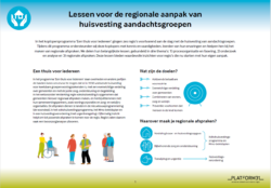 In deze publicatie delen we hun belangrijkste lessen, gebundeld in drie thema’s: 1) procesorganisatie en fasering, 2) onderzoek en analyse en 3) regionale afspraken. Deze lessen bieden waardevolle inzichten voor professionals die betrokken zijn bij het maken van regionale afspraken over de huisvesting van aandachtsgroepen. Dit kunnen procesbegeleiders zijn, of initiatiefnemers, maar ook de deelnemers aan een samenwerkingsverband. De inhoud van de publicatie is gebaseerd op kennis die er is over het bouwen aan regionale samenwerking, het opstellen van effectieve woonzorganalyses en het ontwikkelen van woonzorgvisies. Dankzij de lerende praktijk in de koploperregio’s is deze kennis verrijkt en verdiept.