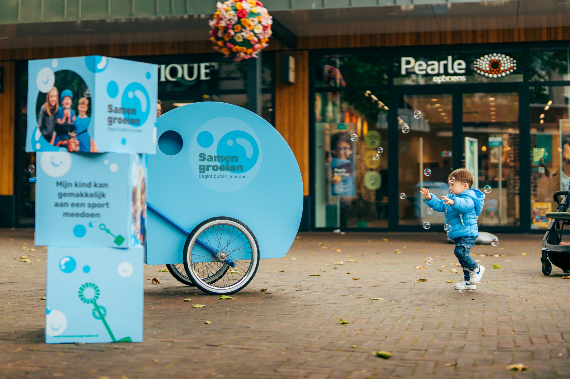 Niet alleen kinderen, maar ook volwassenen moeten volgens Chantal en Cerunne uit hun bubbel komen. “Veel mensen geven aan dat ze inderdaad ook vinden dat iedereen erbij hoort, wel of geen handicap, en dat ze meer zouden moeten doen om kinderen met een handicap gewoon mee te laten doen. Maar ze geven ook aan niet goed te weten wat ze dan kunnen doen.” Met een zogenaamde ‘Bubbelbox’ gaat het Pact daarom de straat op om het gesprek te openen. Cerunne: “De Bubbelbox is een grote ronde blauwe box, waar ook letterlijk bubbels uit komen, waarmee wij de straat op gaan en gesprekken aanknopen. Het is onderdeel van de campagne ‘Samen opgroeien begint buiten je bubbel.’ Ouders met kinderen met een handicap weten soms ook niet wat er allemaal voor hen mogelijk is, die leven in dat opzicht ook in een bubbel. Uiteindelijk moeten we dus allemaal wat meer uit onze bubbel komen.”
