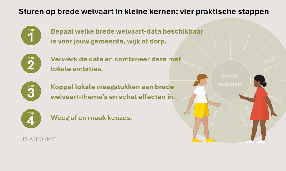 Tijdens ons webinar ‘Sturen op brede welvaart in kleine kernen’ De link naar de opname van dit webinar vind je onderaan dit artikel. 1 zoomden we in op de praktijk in Zeeuwse kernen. Vooruitlopend op dit webinar ontwikkelde Platform31, samen met de Zeeuwse Vereniging van Kleine Kernen (ZVKK) en HZ Kenniscentrum Zeeuwse Samenleving, vier praktische stappen, met brede welvaart als doe- en denkkader Binnen dit artikel en de beschreven stappen gaan we uit van de definitie van brede welvaart van het CBS. 2 Deze aanpak is geïnspireerd op de tien stappen uit het document ‘Aan de slag met brede welvaart als gemeente’ (VNG, Platform31, Tilburg University en het PON & Telos), maar richt zich niet op gemeentelijk beleid. Ze is bedoeld voor kleine (dorps)kernen en biedt concrete handelingsperspectieven. 3 . Die vier stappen – die centraal staan in dit artikel – zijn ontwikkeld met de rol van dorpsraden in het achterhoofd, omdat zij een cruciale schakel vormen tussen inwoners, overheid en maatschappelijke partners Dorpsraden vervullen in veel kleine kernen een verbindende rol: tussen inwoners onderling, tussen inwoners en overheid, en tussen inwoners en maatschappelijke partners. Ze signaleren lokale opgaven, agenderen wat in het dorp speelt en nemen of ondersteunen initiatieven rond leefbaarheid, voorzieningen en sociale samenhang. 4 . Om de aanpak optimaal af te stemmen op de praktijk vroegen we vooraf meerdere Zeeuwse dorpsraden naar hun ervaringen en uitdagingen. De inhoud van het webinar, waarvan de opname onderaan dit artikel te vinden is, is ook relevant voor kleine kernen buiten Zeeland.