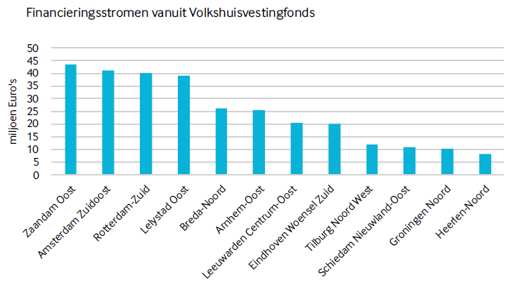 Het Volkshuisvestingsfonds (officieel: Regeling specifieke uitkering herstructurering volkshuisvesting) is bedoeld voor de verbetering van de woonkwaliteit, leefomgeving en verduurzaming van stedelijke gebieden en grens- en krimpregio’s (uitkering 2021/2022 – totaalbudget 450 miljoen euro). ‘Subsidies & Financiering – Volkshuisvestingsfonds’ (2022). Rijksdienst voor Ondernemend Nederland. 15 Gebieden die vallen onder de 16 stedelijke vernieuwingsgebieden en/of grens- en krimpregio’s maakten volgens de regeling een grotere kans om de aanvraag toegekend te krijgen. Het nieuwe regeerakkoord belooft een verlenging van het Volkshuisvestingsfonds. Geld uit het Volkshuisvestingsfonds moet primair worden ingezet ter verbetering en verduurzaming van de woningvoorraad (herstructurering van wijken; domeinen duurzaamheid en wonen). Daarnaast is het mogelijk om met een goede onderbouwing ook de openbare ruimte te verbeteren (domein leefomgeving & openbare ruimte). De ingrepen moeten onderdeel uitmaken van een bredere aanpak op het gebied van leefbaarheid in de wijk, maar het geld is niet bedoeld voor de bredere aanpak zelf. Staatscourant 2021-12579 (2021), ‘Besluiten van algemene strekking’. Rijksoverheid: Den Haag. 16 Ministerie VRO (2022), ‘Algemene beleidsbrief portefeuille Volkshuisvesting en Ruimtelijke Ordening. Brief aan de Tweede Kamer van minister de Jonge’. Den Haag: Rijksoverheid. 17 Het geld kan op drie manieren besteed worden: